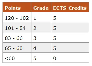 There will be a test at the end of the course where you can acquire a maximum of 60 points. Another 60 points can be assigned to you through active participation during class (1 contact hour equals 1 point). See the correlation of points, grades and credits in the following chart: