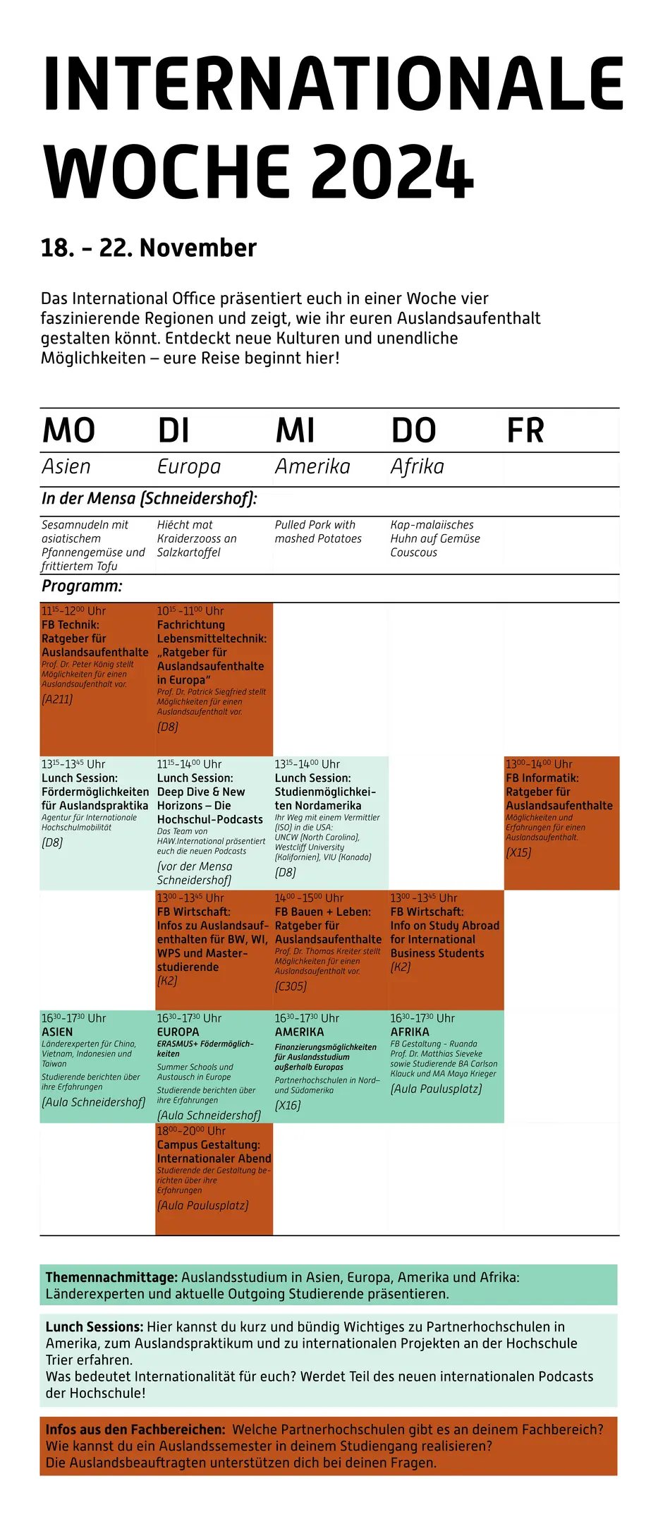 Das International Office präsentiert euch in einer Woche vier faszinierende Regionen und zeigt, wie ihr euren Auslandsaufenthalt gestalten könnt. Entdeckt neue Kulturen und unendliche Möglichkeiten – eure Reise beginnt hier!