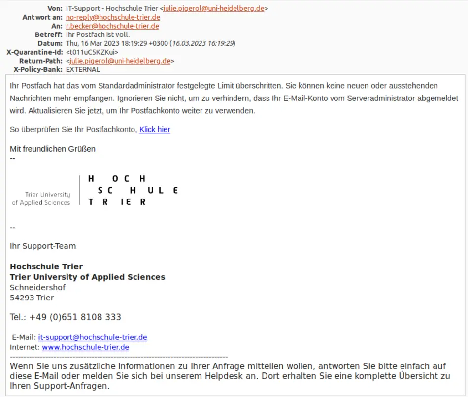 Als Absendeadressen wird eine Adresse vom Umwelt-Campus Birkenfeld und der Uni Heidelberg verwendet.
