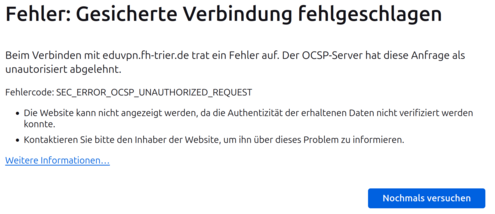 Firefox zeigt vereinzelt den Fehler "Gesicherte Verbindung fehlgeschlagen" (Fehlercode SEC_ERROR_OCSP_UNAUTHORIZED_REQUEST) an. Namendlich bei eduVPN…