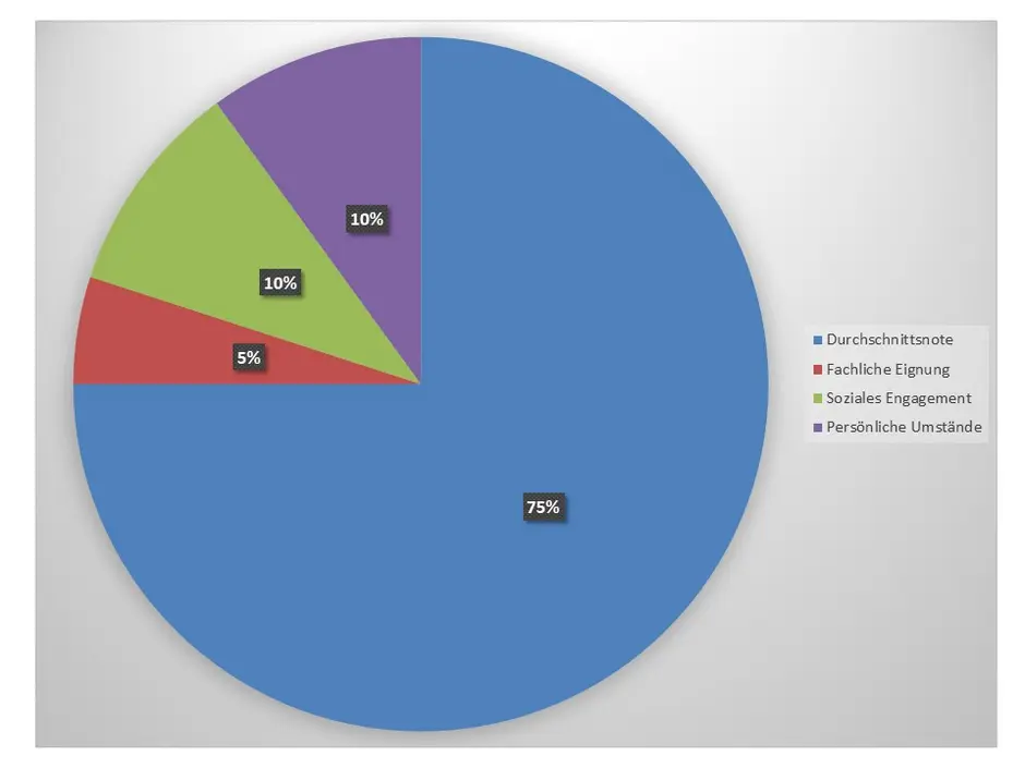 Die Bewertung der Bewerbungen erfolgt anhand einer festgelegten Kriterienliste. Dabei entfallen 75 Prozent der zu vergebenden Bewertungspunkte auf die Note, 5 Prozent auf die fachliche Eignung, 10 Prozent auf das soziale Engagement und 10 Prozent auf die persönlichen Umstände des Bewerbers.