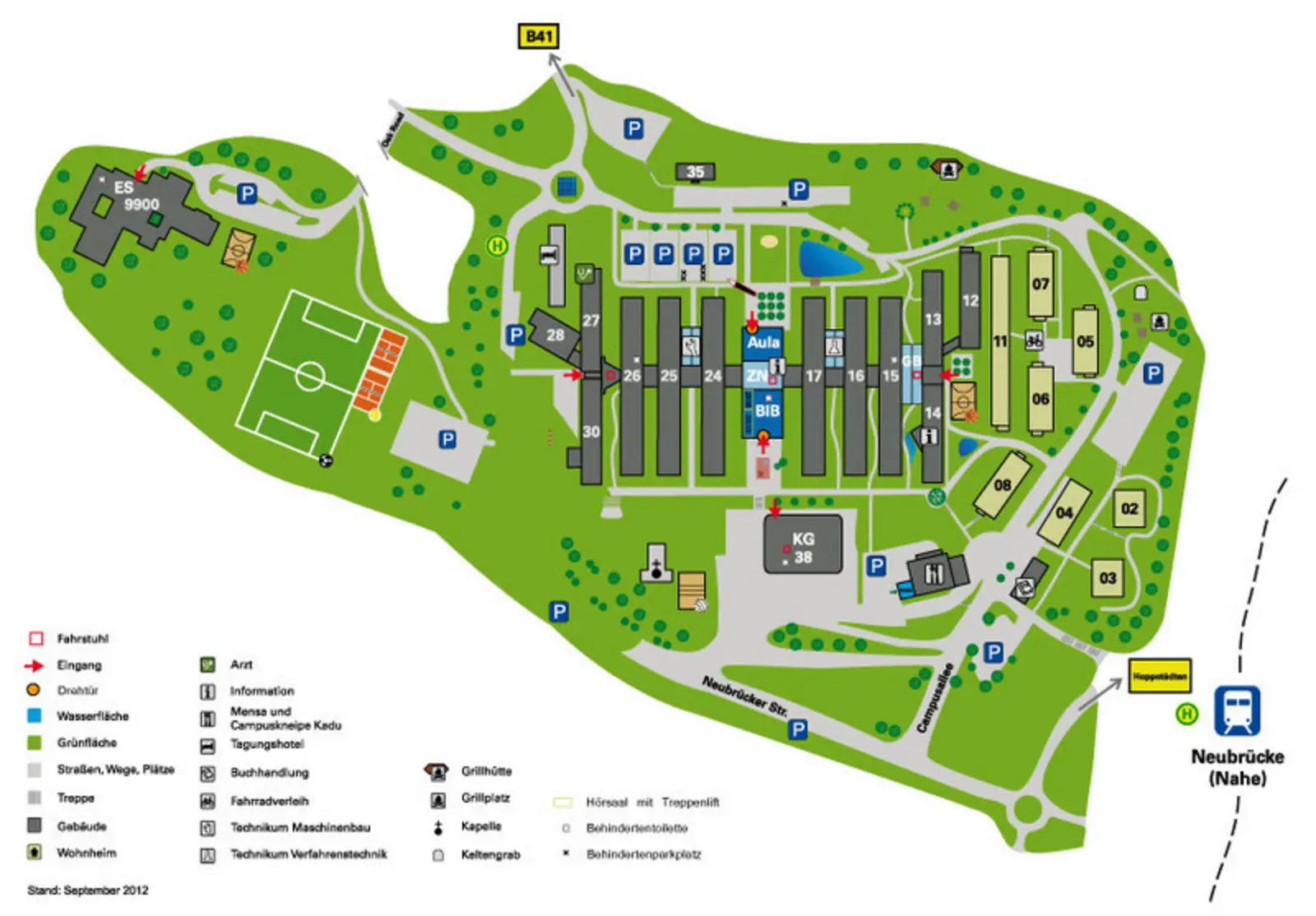 Auf dem Campusgelände gibt es eine Bushaltestelle „Neubrücke Campus“, die auch vom Bahnhof „Neubrücke (Nahe)“ angefahren wird. Dadurch kann auch den Bahnreisenden der Fußweg (Treppe) erspart werden. Für Anreisende mit dem Auto stehen 5 Behindertenparkplätze vor dem 24er Gebäude und einer auf dem Parkplatz gegenüber der Aula zur Verfügung (siehe Campusplan).